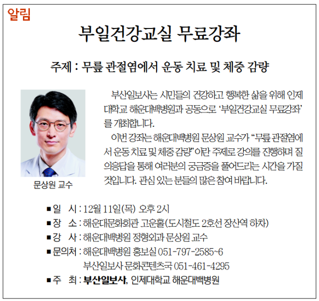 이번 강좌는 해운대백병원 문상원 교수가 "무릎 관절염에서 운동 치료 및 체중 감량"이란 주제로 강의를 진행하며 질의응답을 통해 여러분의 궁금증을 풀어드리는 시간을 가질 것입니다. 관심 있는 분들의 많은 참여 바랍니다.