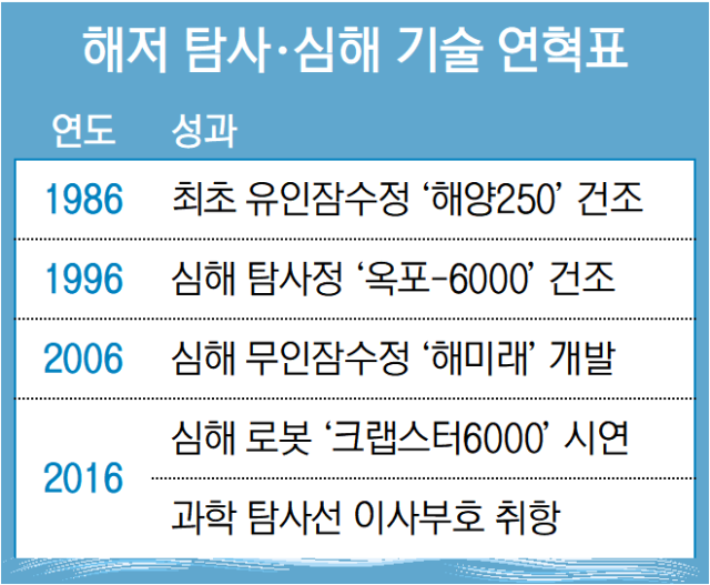 2006년 한국해양과학기술원(KIOST)은 심해 무인 잠수정 ‘해미래’를 개발했다. 미국·일본·프랑스에 이어 네 번째로 심해 6km 탐사가 가능한 무인잠수정을 확보한 것이다. 2016년 개발된 해저보행 로봇 크랩스터6000(CR6000)은 북태평양 해저 4700m를 넘는 구역에서 시연에 성공하기도 했다.