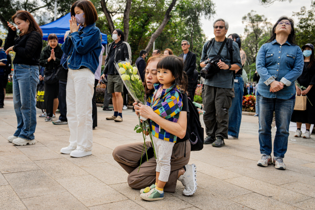 지난달 26일(현지 시간) 홍콩 북부 아파트에서 발생한 화재의 사망자가 159명까지 늘어난 가운데, 3일 화재 현장 근처에 마련된 추모 장소에서 한 어린이가 꽃을 들고 있다. EPA연합뉴스