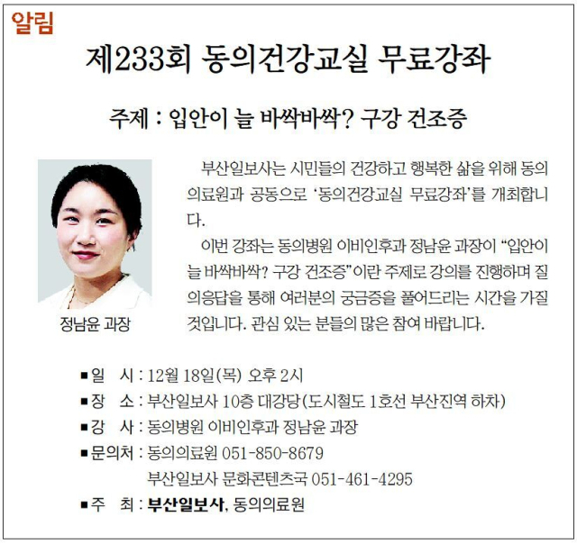 이번 강좌는 동의병원 이비인후과 정남윤 과장이 "입안이 늘 바싹바싹? 구강 건조증"이란 주제로 강의를 진행하며 질의응답을 통해 여러분의 궁금증을 풀어드리는 시간을 가질 것입니다. 관심 있는 분들의 많은 참여 바랍니다.