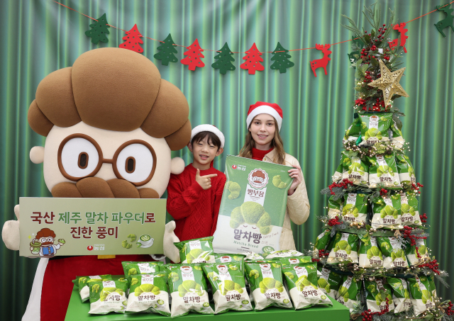 18일 서울 롯데마트 서울역점에서 모델들이 농심 베이커리 스낵 신제품 ‘빵부장 말차빵’을 홍보하고 있다. 연합뉴스