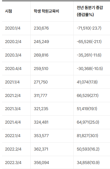 사교육비는 2020년 1∼4분기 내내 감소하고 그 이후론 18분기 연속 증가했다.