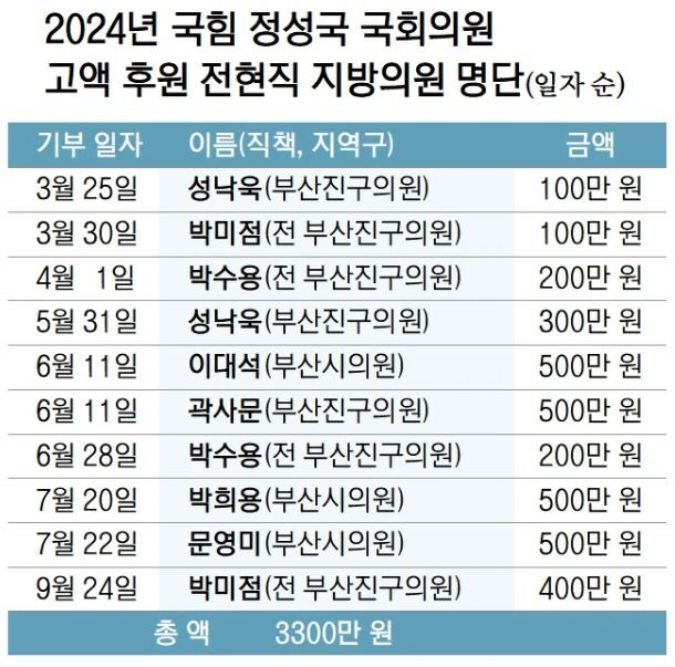 이날 〈부산일보〉가 중앙선거관리위원회의 ‘2024년도 연간 300만 원 초과 기부자 명단’을 분석한 결과, 부산 국회의원 18명 가운데 자신의 지역구 내 지방의원으로부터 고액 후원을 받은 인사는 정 의원이 유일했다.