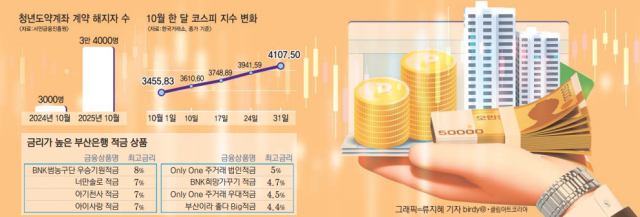 실제 22일 서민금융진흥원에 따르면, 2023년 6월 도입 이후 지난 10월 말까지 청년도약계좌를 개설한 242만 5000명 중 44만 3000명(18.2%)이 계약을 중도해지 했다. 이 중 절반에 가까운 20만 9000명이 올해 1~10월에 해지를 신청했다. 특히 코스피 지수가 급등하던 지난 10월 한 달 동안 계약을 해지한 사람은 3만 4000명가량으로, 지난해 10월 3000명에 비하면 10배 이상 늘었다. 지난 10월 한 달간 코스피 지수는 1일 3455.83에서 31일 4107.50으로 수직상승했다.