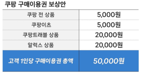보상안은 1인당 5만 원 규모로 쿠팡 전체 상품과 쿠팡이츠·트래블·알럭스 구매 이용권 형태로 지급된다. 지난 11월 말 개인정보 유출 통지를 받은 3370만 계정의 이용자가 대상이다.