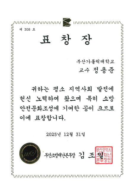 부산가톨릭대학교(총장 홍경완) 소방방재학과의 정용준 교수는 부산지역의 소방안전문화조성에 기여한 공이 인정되어 부산소방재난본부장 표창을 받았다.