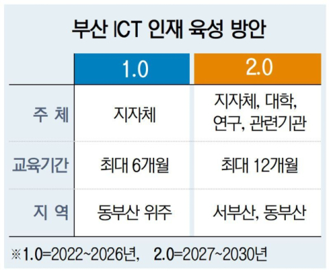 부산시와 부산정보산업진흥원은 이를 위한 인재 육성 방안을 마련하고자 ‘부산 ICT 인재 양성 발전방안’ 용역을 추진하고 있다. 부산정보산업진흥원은 2022년부터 지역 내 ICT 분야 고급 인력을 양성하고 취업을 연계하는 ‘부산디지털혁신아카데미’(BDIA) 교육 사업을 진행해 오고 있다. BDIA는 올해 6303명의 수료생을 배출했으며, 이 가운데 3116명이 취업에 성공하는 성과를 거뒀다.