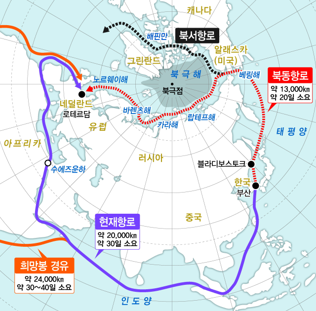 북극항로를 준비해야 하는 또 다른 이유는 운항 거리 측면의 장점이다. 북동항로는 부산항과 네덜란드 로테르담항을 연결하는 최단거리 항로다. 항해 일수 단축은 연료비 절감과 탄소 배출 감소로 이어진다. 부산항이 단순한 동북아 거점항을 넘어 글로벌 환적 허브로 도약할 가능성도 함께 커진다.
