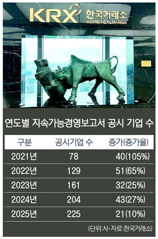 한국거래소는 5일 유가증권시장 상장법인 중 지난해 지속가능경영보고서를 자율적으로 공시한 기업은 225개 사로 전년(204개 사) 대비 10% 늘었다고 밝혔다.