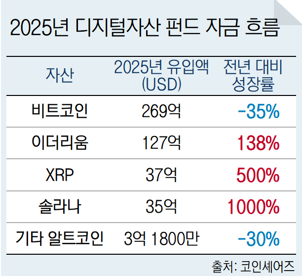 알트코인 중에는 이더리움이 127억 달러의 자금을 끌어들이며 전년 대비 138% 증가했다. XRP와 솔라나 역시 각각 37억 달러, 36억 달러가 유입되며 500%, 1000%에 달하는 폭발적인 증가율을 기록했다. 반면 기타 알트코인 투자 상품으로의 유입은 3억 1800만 달러에 그쳐 전년 대비 30% 감소했다.