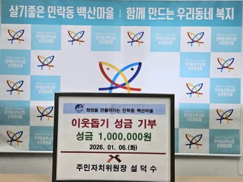 부산 수영구 민락동 행정복지센터(동장 박해원)는 지난 6일 주민자치위원회 설덕수 위원장이 이웃돕기성금 100만 원을 기탁했다고 밝혔다.