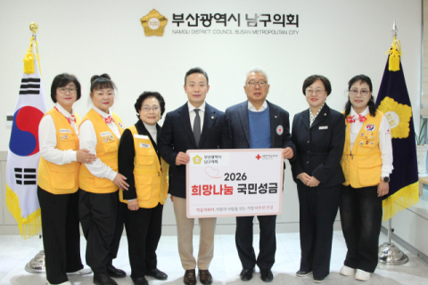 부산광역시 남구의회(의장 서성부)는 9일 오전 9시 30분 남구의회 2층 의장실에서 「2026년도 적십자 희망나눔성금 전달식」을 개최하고 대한적십자사 부산광역시지사에 성금 100만 원을 전달했다고 밝혔다.