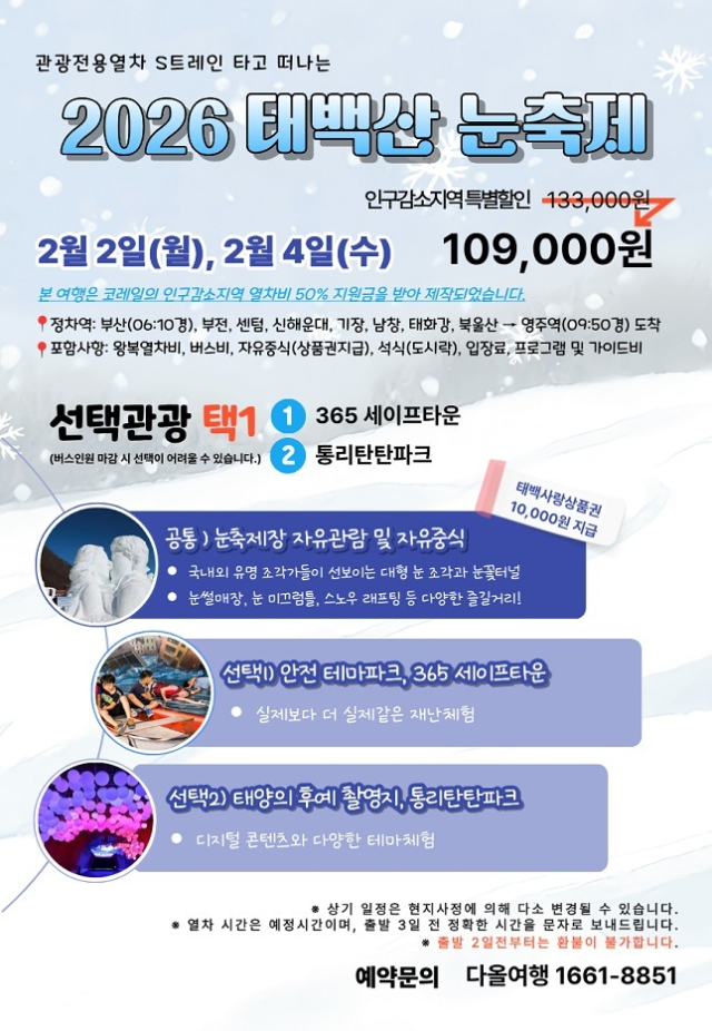 ‘태백산 눈축제 기차여행’은 눈을 보기 어려운 부산지역 고객들을 위한 상품이다. 인구감소 지역 철도운임 50% 할인과 태백시의 관광 혜택을 연계해 실속 있는 여행을 즐길 수 있다.