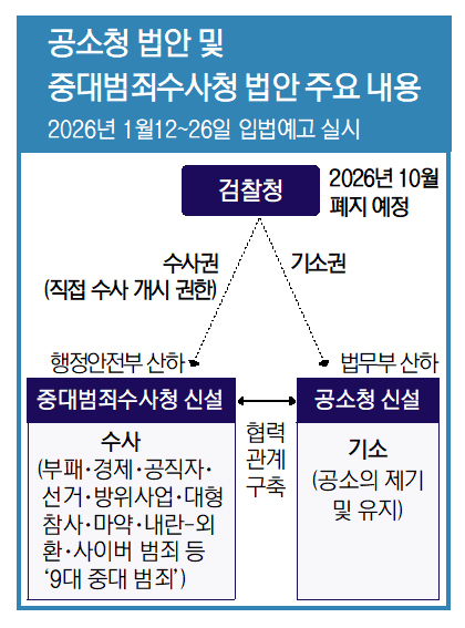 정부가 오는 10월 출범을 목표로 공소청과 중대범죄수사청(중수청) 설치 법안을 마련했다. 법안에는 기존 검찰을 공소 전담 기관으로 재편하고, 중수청이 9대 중대범죄를 전담 수사하도록 하는 내용이 담겼다. 다만 공소청 검사의 보완수사권 존치 여부와 중수청 수사 인력을 수사사법관·전문수사관으로 이원화하는 조직 구조를 두고 논란이 이어질 전망이다.