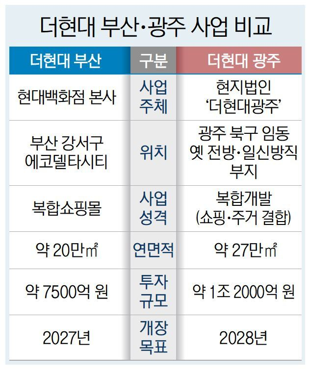 반면 부산 강서구 에코델타시티에 들어서는 ‘더현대 부산’은 별도 현지법인 설립 없이 현대백화점이 사업을 추진하고 있다. 더현대 부산은 에코델타시티 내 약 11만㎡ 부지에 연면적 20만㎡ 규모로 조성되며, 현대백화점은 약 7500억 원을 투자할 계획이다. 지난해 12월 착공했으며, 2027년 개장을 목표로 하고 있다.