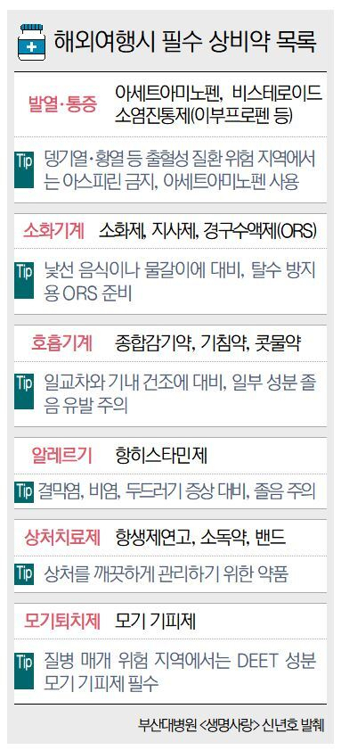 여행지에 따라 준비해야 할 상비약도 있다. 열대 지역을 방문할 때는 지역에 따라 말라리아 예방을 위한 예방약이 필요할 수 있다. 고산지대를 여행한다면 고산병 예방을 위한 약물을 준비해야 한다. 질병 매개 위험 지역에서는 DEET 성분의 모기 기피제가 필수다. 배 부장은 “출국 전에는 질병관리청과 해외감염병 사이트 등을 통해 해외 감염병 정보를 확인하고 영문 처방 내역서와 진단서를 준비해야 한다”며 “여행일 수에 여유분 2~3일분을 더 챙기고, 냉장이 필요한 약은 보냉 가방을 활용해 약품 변질을 막는 것이 좋다”고 조언했다.