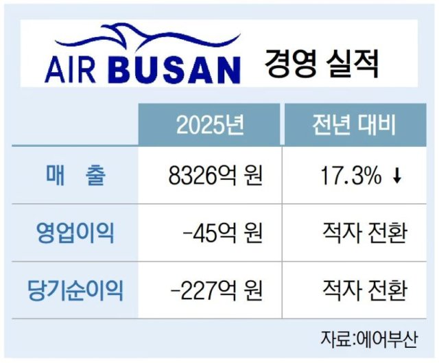 에어부산이 25일 발표한 ‘2025년 실적’에 따르면, 에어부산은 작년에 매출 8326억 원을 올려 전년(1조 68억 원)보다 매출이 17.3% 감소했다. 영업이익은 45억 원 적자, 당기순이익은 227억 원 적자다. 이는 2024년에 영업이익 1463억 원, 당기순이익 24억 원 흑자에서 적자로 전환한 것이다. 작년 4분기 실적만 살펴보면 매출 2354억 원에 영업이익 50억 원 적자, 당기순이익 322억 원 적자다.