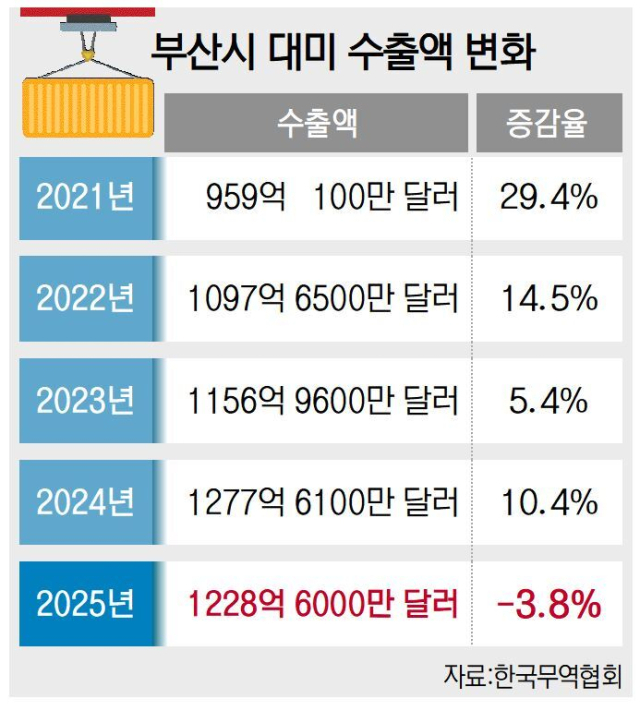 지난해 ‘트럼프 관세’ 여파로 철강업계를 비롯한 지역 기업들 피해는 상당히 컸다. 실제 트럼프 관세가 부과됐던 지난해 부산지역 대미 수출은 1228억 6000만 달러로 전년 대비 3.8% 줄었다. 이는 2016년 이후 첫 감소세다.