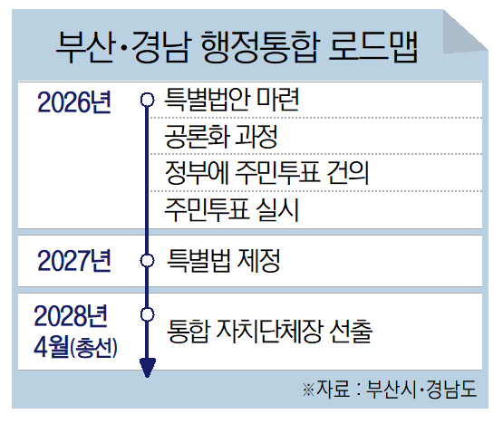 부산시와 경남도가 연내 주민투표와 내년 특별법 제정을 거쳐 2028년 통합 자치단체장을 선출한다는 행정통합 로드맵을 내놓았다.