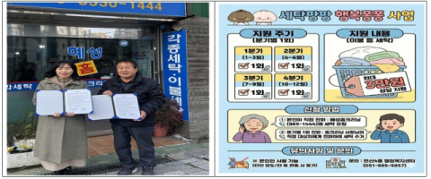부산 연제구 연산4동(동장 이가미)은 27일 지역 내 세탁업체 혜성홈크리닝(대표 김정임)과 생활 밀착형 돌봄 지원을 위한 ‘세탁팡팡 행복퐁퐁’ 사업 업무협약을 체결하고, 2024년부터 시행해 온 생활 밀착형 돌봄 서비스인 ‘세탁팡팡 행복퐁퐁’ 사업을 확대 추진한다.