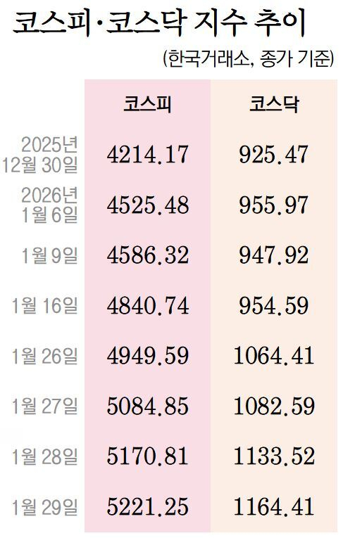 29일 코스피가 사상 처음으로 장중 5200선을 돌파한 가운데 서울 중구 하나은행 딜링룸 현황판에 코스피·코스닥 지수가 표시되고 있다. 연합뉴스 29일 코스피가 사상 처음으로 장중 5200선을 돌파한 가운데 서울 중구 하나은행 딜링룸 현황판에 코스피·코스닥 지수가 표시되고 있다. 연합뉴스