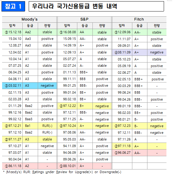 우리나라 국가신용등급 변동 내역. 재정경제부 제공