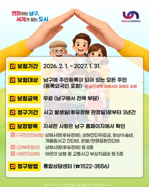 남구청 관계자는 “구민안전보험 보장 항목 확대를 통해 일상에서 발생할 수 있는 사고에 대한 지원을 보완했다”며 “앞으로도 구민 안전을 위한 제도 운영을 지속적으로 추진해 나가겠다”고 말했다.