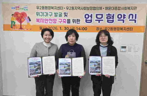 해운대구 우2동 행정복지센터(동장 백민정)는 지난달 30일 우2동 지역사회보장협의체(민간위원장 김외옥), 해운대종합사회복지관(관장 이경희)과 함께 ‘위기가구 발굴 및 복지 안전망 구축’을 위한 업무협약을 체결했다.