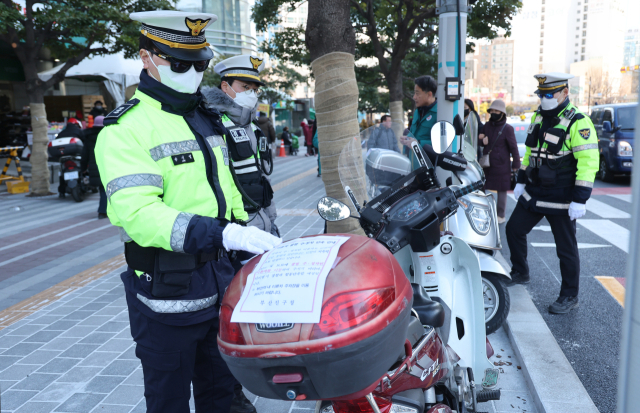 3일 오후 부산 부산진구 부전시장 일대에서 부산진구청과 부산진경찰서가 주민불편 해소와 이륜자동차 안전운행을 위해 불법주정차, 미등록, 무단방치 이륜자동차 등을 합동단속하고 있다.