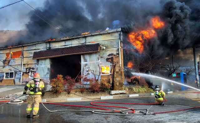 7일 오전 10시 24분께 김해시 대동면의 한 창고에서 불이 나 소방당국이 이를 진압하고 있다. 이날 함양군과 거창군에서도 산불이 나는 등 건조한 날씨 탓에 경남에서는 화재가 잇따르고 있다. 경남소방본부 제공