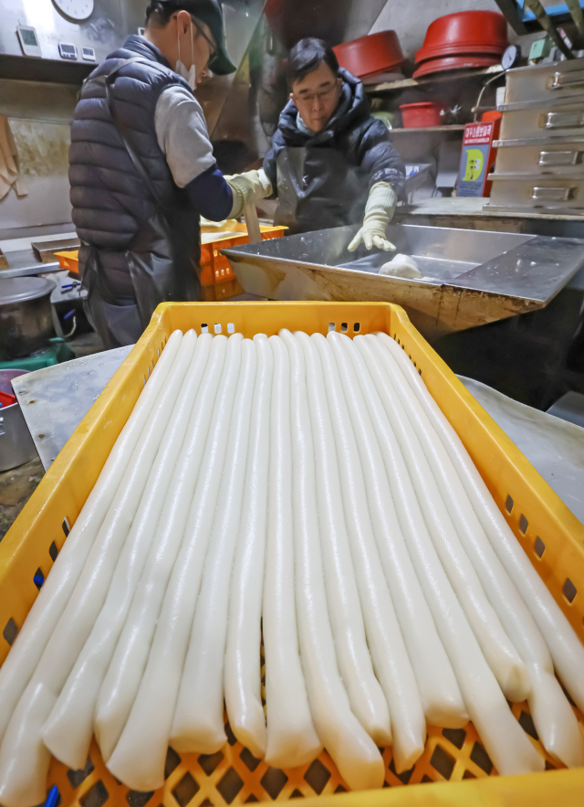 설 명절을 앞둔 12일 오전 부산 부산진구 부전동 부전시장 한 떡방앗간에서 상인들이 먹음직스러운 가래떡을 뽑아내느라 분주한 손길을 놀리고 있다.