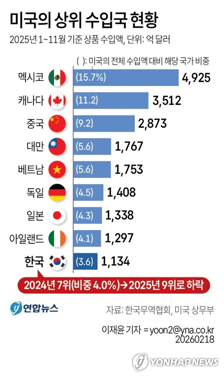 지난해 한국보다 앞선 미국의 1∼8위 수입국은 멕시코(4925억 달러·15.7%), 캐나다(3512억 달러·11.2%), 중국(2873억 달러·9.2%), 대만(1767억 달러·5.6%), 베트남(1753억 달러·5.6%), 독일(1408억 달러·4.5%), 일본(1338억 달러·4.3%), 아일랜드(1297억 달러·4.1%)로 조사됐다.