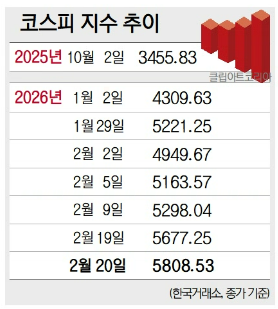 22일 한국거래소에 따르면 설 연휴가 끝나자마자 코스피는 이틀 연속 급등세를 이어가며 ‘육천피(코스피 6000포인트)’를 가시권에 넣었다. 지난 20일 코스피는 전 거래일보다 131.28포인트(2.31%) 오른 5808.53에 장을 마감했다. 이날 지수는 19.64포인트(0.35%) 오른 5696.89로 개장한 뒤 우상향 흐름을 지속했으며, 오후 2시 37분께는 5809.91까지 치솟기도 했다. 코스피가 5800선을 넘어선 건 이날이 처음이다.