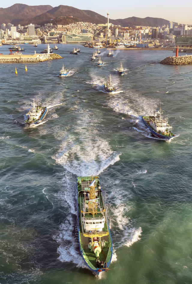국내 고등어 어획량의 80% 이상을 담당하는 대형선망수협 소속 16개 선단의 어선들이 23일 오전 부산 서구 부산공동어시장에서 설 연휴 이후 첫 조업을 위해 출항하고 있다.