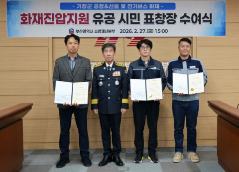 부산소방재난본부(본부장 김조일)는 지난 1월과 2월 기장군 일대에서 발생한 공장·임야 화재와 전기버스 화재 현장에서 적극적인 지원활동을 펼친 단체와 민간인에게 27일 표창을 수여했다고 밝혔다.