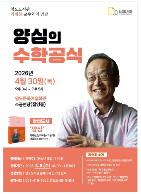 영도도서관 관계자는 “최재천 교수님의 통찰을 통해 영도구민들이 일상 속 양심의 가치를 되새기고, 서로를 배려하는 고결한 공정의 의미를 체감하는 소중한 기회가 되길 바란다”고 전했다.