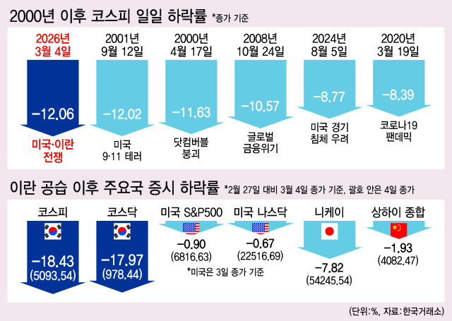 잘 나가던 한국 증시는 미국과 이란 간 전쟁이 촉발한 ‘중동 사태’로 예기치 못한 찬물을 뒤집어썼다. 전쟁이 발발한 후 첫 거래일인 지난 3일 코스피는 7.24%, 코스닥은 4.62% 각각 하락했다. 4일은 하락세가 더 가팔라졌다. 코스피는 12.02%, 코스닥은 14.00% 폭락하며 세계 주요국 주가 지수 중 하락률 1·2위를 차지했다. 일본(-3.61%), 중국(-0.98) 등 아시아 주요국과 비교해도 낙폭이 두드러진다.