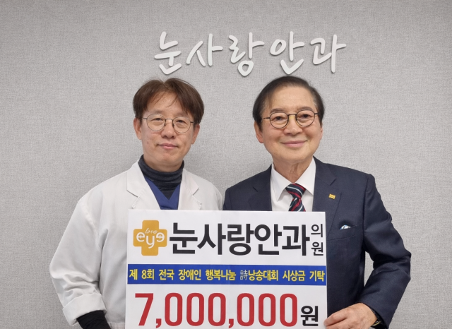 부산국제장애인협의회는 눈사랑안과의원 전웅찬 원장으로부터 지난 10일 부산 서면 눈사랑안과의원에서 제8회 전국 장애인 행복나눔 시낭송대회 시상금으로 700만 원을 기탁받았다고 밝혔다.
