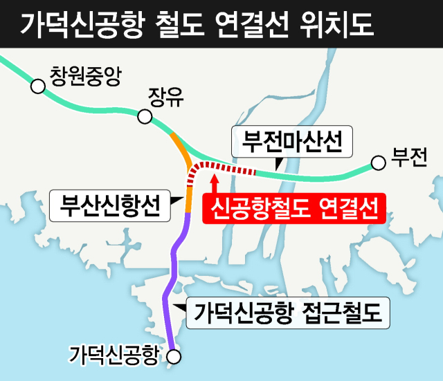 가덕도 신공항철도 연결선은 현재 건설 중인 부전~마산 복선전철과 현재 건설돼 있는 부산신항선을 잇는 6.58km 연결선이다. 총 사업비는 6025억 원이고 2034년 개통이 목표다.