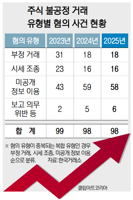 혐의 유형별로는 ‘미공개 정보 이용’이 58건(59.2%)으로 가장 많았다. 이어 부정 거래 18건(18.4%), 시세 조종 16건(16.3%) 등의 순이었다. 공개 매수와 관련한 미공개 정보 이용 사건은 2023년 2건에 불과했지만 2024년 12건, 지난해 11건으로 지속적으로 발생하고 있는 것으로 나타났다. 기업 경영권 안정이나 상장 폐지, 주주 권익 보호 등을 목적으로 진행되는 공개 매수 정보가 공시 전에 유출돼 이를 악용한 사례들이다. 실제로 공개 매수 실시 정보를 차명 계좌로 이용하거나 지인에게 전달해 부당 이득을 챙긴 혐의로 증권사 임원이 압수수색을 받는 등 금융권 종사자의 도덕적 해이도 심각한 것으로 드러났다.