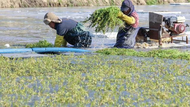 11일 오전 부산 기장군 철마면의 한 미나리꽝에서 농민들이 미나리 수확 작업을 하고 있다. 철마 미나리는 아삭한 식감과 향긋한 향으로 인기가 높고 해독 작용과 혈액 정화 효과가 있는 것으로 알려져 먹거리로 사랑받고 있다.