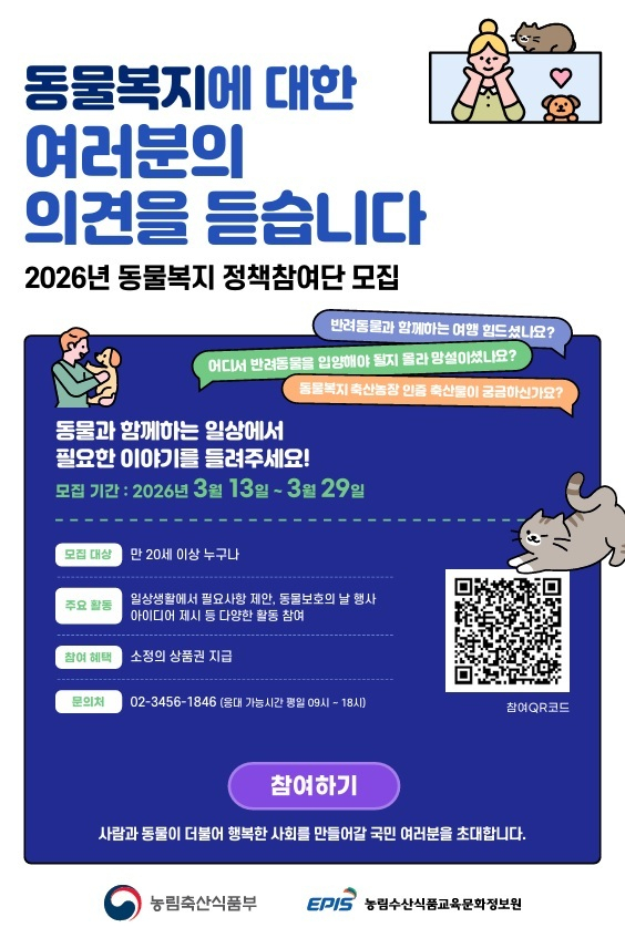 농림축산식품부는 동물과 함께 하는 현장의 생생한 목소리를 정책에 반영하기 위해 ‘농식품부와 함께 하는 동물복지 정책참여단’을 모집한다고 12일 밝혔다.