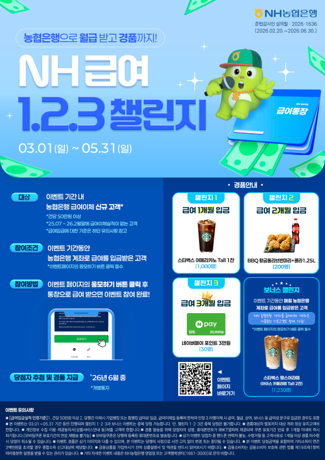 기존 급여이체 고객 중 이벤트 기간 동안 매월 농협은행 계좌로 급여를 받은 1230명을 추첨하여 스타벅스 라떼 2잔을 경품으로 증정하는 보너스 챌린지도 진행한다.