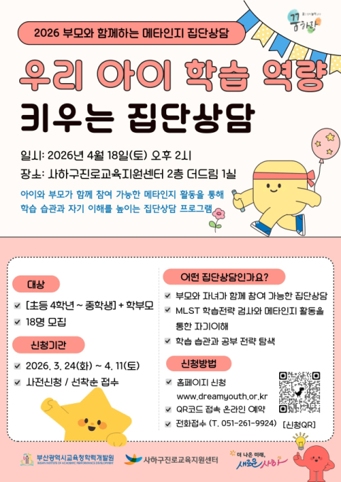 사하구진로교육지원센터는 오는 4월 18일 토요일 오후 2시 MLST 학습전략 검사와 부모·자녀 간 학습 역지사지 역할극 활동을 통해 타인과 자기 이해에 도움을 주는 ‘메타인지 집단상담’ 프로그램을 운영한다.