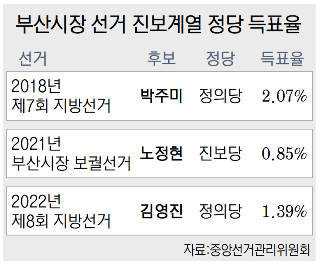 2021년 부산시장 보궐선거에서 진보당 노정현 후보는 1만 3054표(0.85%)를 얻었고, 2018년 부산시장 선거에서 정의당 박주미 후보는 3만 5299표(2.07%)를 득표했다. 직전인 2022년 선거 때도 정의당 김영진 후보가 1만 9733표(1.39%)를 얻었다.