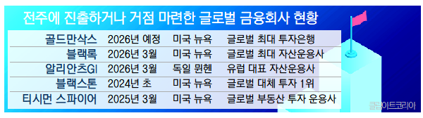 25일 금융투자업계에 따르면 월가 대표 투자은행(IB) 골드만삭스는 전주에 사무소 개설을 추진 중이다. 앞서 지난 13일과 23일 독일의 자산운용사 알리안츠 글로벌인베스터스(GI)와 세계 최대 자산운용사 블랙록이 각각 사무소를 열었다.