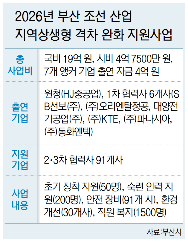 31일 부산시 등에 따르면 부산시는 '2026년 부산 조선산업 지역상생형 격차 완화 지원사업'을 본격 추진하기로 하고 1일부터 부산상공회의소를 통해 지원 기업과 지원자를 모집한다.