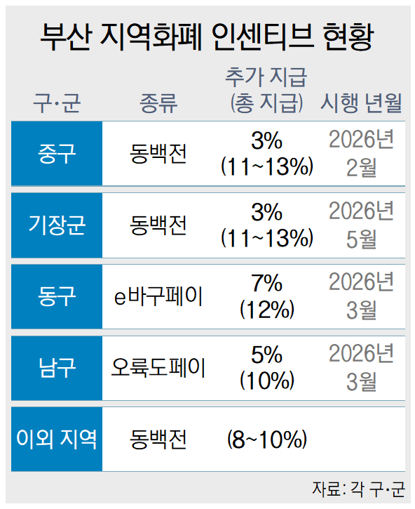 자체 지역화폐를 발행하는 지자체들도 지난달부터 인센티브 지급률을 확대했다. 동구청은 e바구페이의 인센티브 지급률을 기존 충전액의 5%에서 12%로 대폭 늘렸다. 남구청의 오륙도페이도 기존 5%이던 인센티브 지급률을 10%로 상향했다. 이들 지역화폐는 동백전과 달리 지역화폐를 충전하는 즉시 적립금이 지급된다. 동백전 결제로 발생한 추가 캐시백과 e바구페이, 오륙도페이 등 자체 지역화폐는 해당 지역에서만 사용할 수 있도록 설계됐다.
