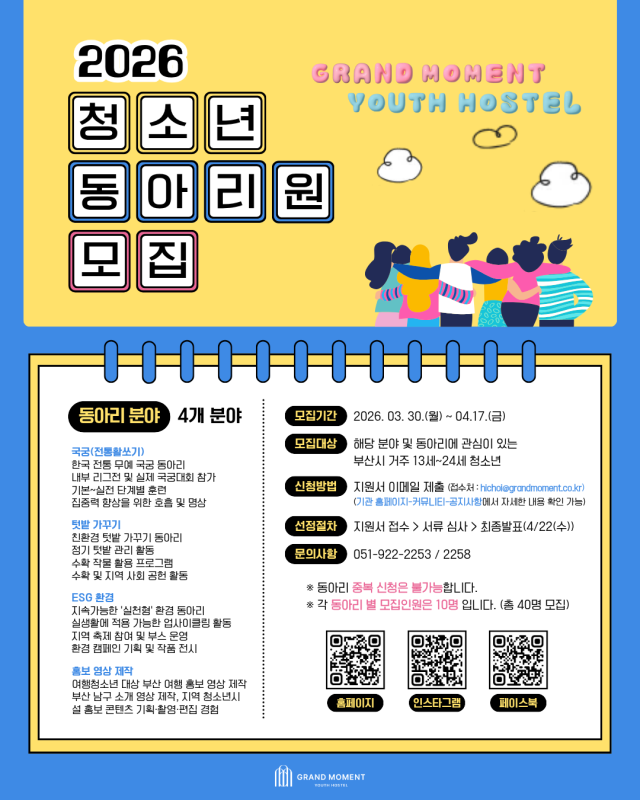 부산 남구 그랜드모먼트 유스호스텔(운영대표 박수영)은 오는 17일까지 청소년동아리 신규 회원을 모집한다.
