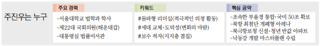 1975년생인 주 의원은 부산 대연고를 졸업하고 서울대 법대를 거쳐 사법시험에 합격했다. 이후 검사로 법조계에 입문해 부산지검과 서울동부지검 등에서 근무했다. 주 의원은 박근혜 정부 시절 청와대 민정수석실에서 근무했는데 당시 특검의 압수수색을 둘러싼 대치 상황을 맞이하기도 했다. 문재인 정부 시절에는 환경부 블랙리스트 사건을 수사하고 청와대 압수수색을 하며 주목받기도 했다. 주 의원은 이 때문에 좌천성 인사 발령을 받았고 이후 사표를 내고 검찰을 떠났다. 일련의 사태를 겪은 주 의원은 이에 스스로를 ‘보수의 적자’로 규정한다.